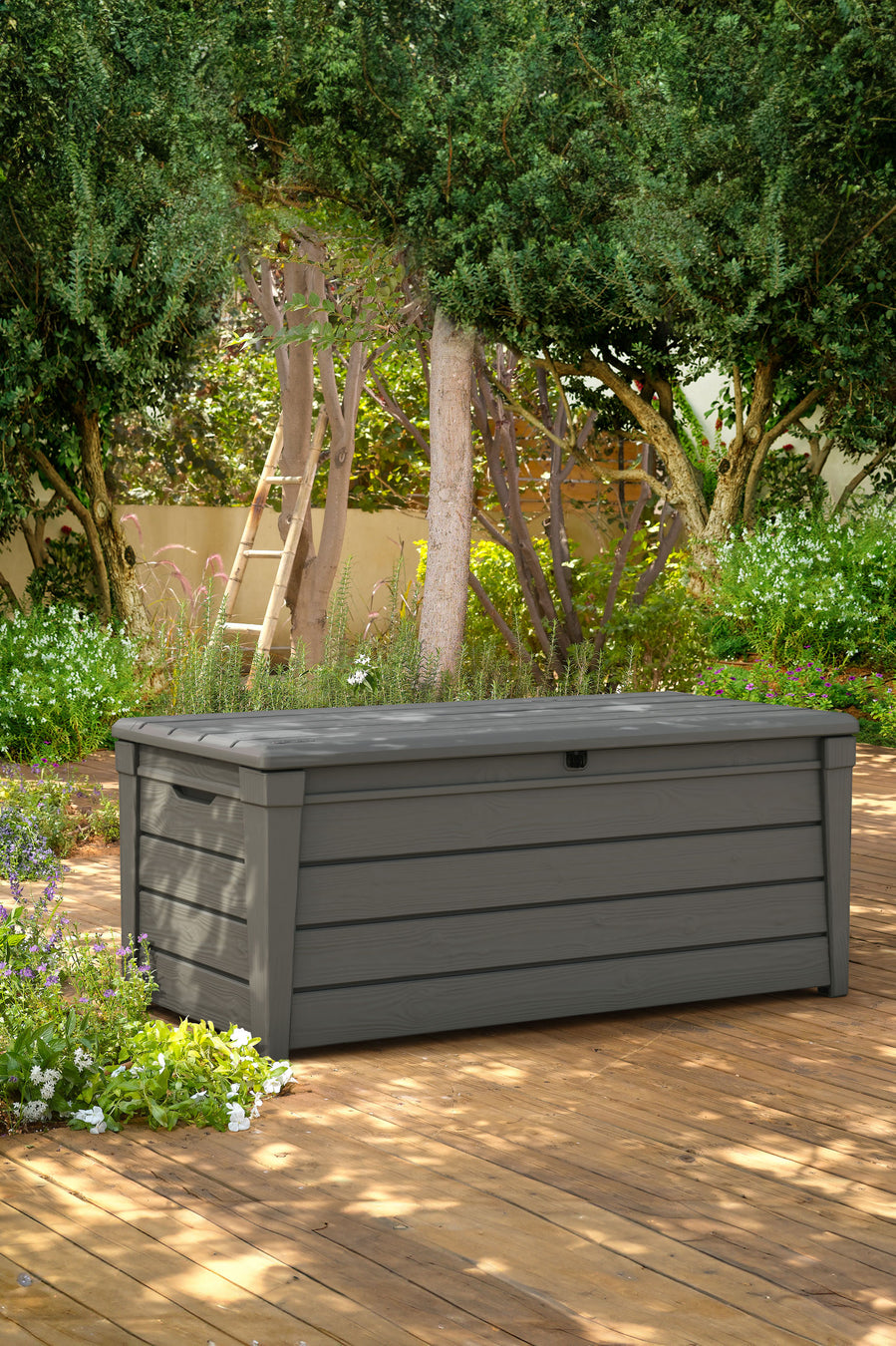 The Keter Brightwood Resin 120 Gallon Outdoor Storage Deck Box in Graphite color will outfit your deck or patio with great seating and great storag...