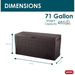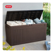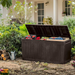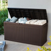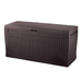 Made of high quality wood-like plastic resin, it is Full weather and UV resistant for exceptional longevity. Its warm and natural brown shade blends harmoniously into any outdoor environment. With its generous 270 litre capacity, you can easily store your outdoor cushions, garden tools, children's toys and much more! Its hinged lid opens smoothly 90 degrees for easy access to your belongings. The integrated side handles allow you to move it easily.