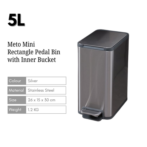 Yubin 5L Meto Rectangle Pedal Bin Stainless Steel with Inner Bucket SilverYubinOriginal price $62.00Original price $62.00 - Original price $62.00Original price $62.00Current price $49.00$49.00 - $49.00Current price $49.00| /in stockElevate your waste management with the Meto Square Pedal Bin. Crafted from durable stainless steel, this bin combines functionality with modern aes... View full detailsOriginal price $62.00Original price $62.00 - Original price $62.00Original price $62.00Current price $49.00$49.00 - $49.00Current price $49.00| /Save 21% Save %